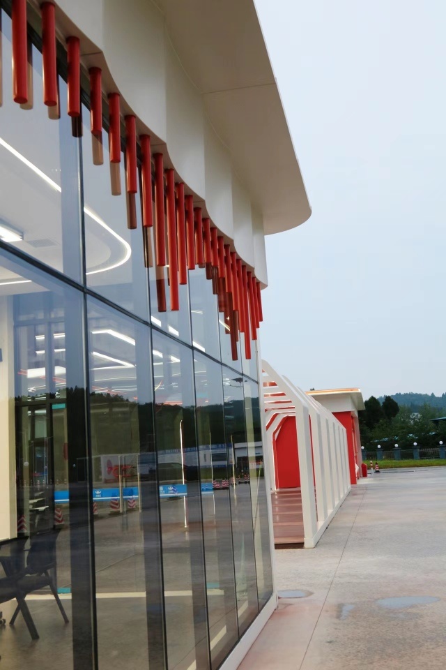 项目设计理念:采用装配式模块化房屋的概念。满足展示厅使用功能为前提下,提升其建筑的现代感和科技验感积极采用新技术、新工艺、新材料。符合环保、自由拆卸、循环利用、施工高效。整体建筑平面呈“U”型状,总长为51米.内部平面功能布局采用单线引导式展示体验方式,较为简单的动线可以提供更好的展示体验效果